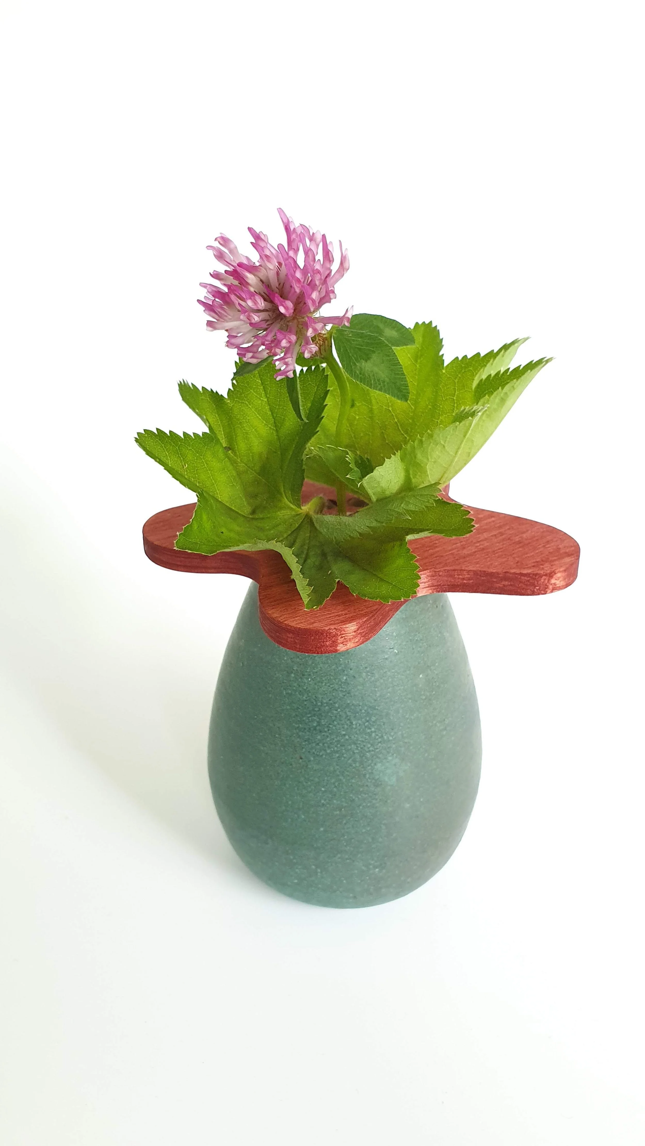 A sculpture, a vase in bloom even without a flower. Glazed stoneware and colored wood.